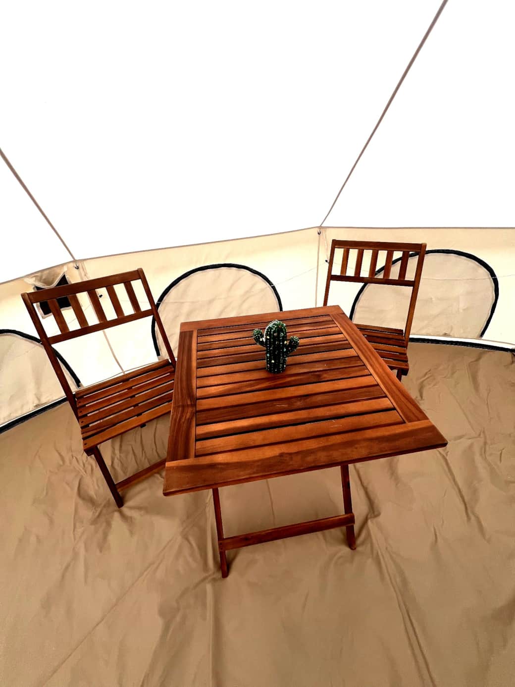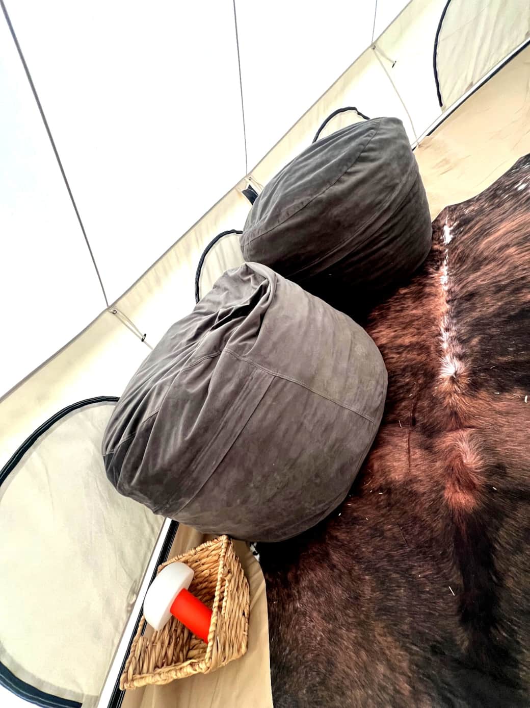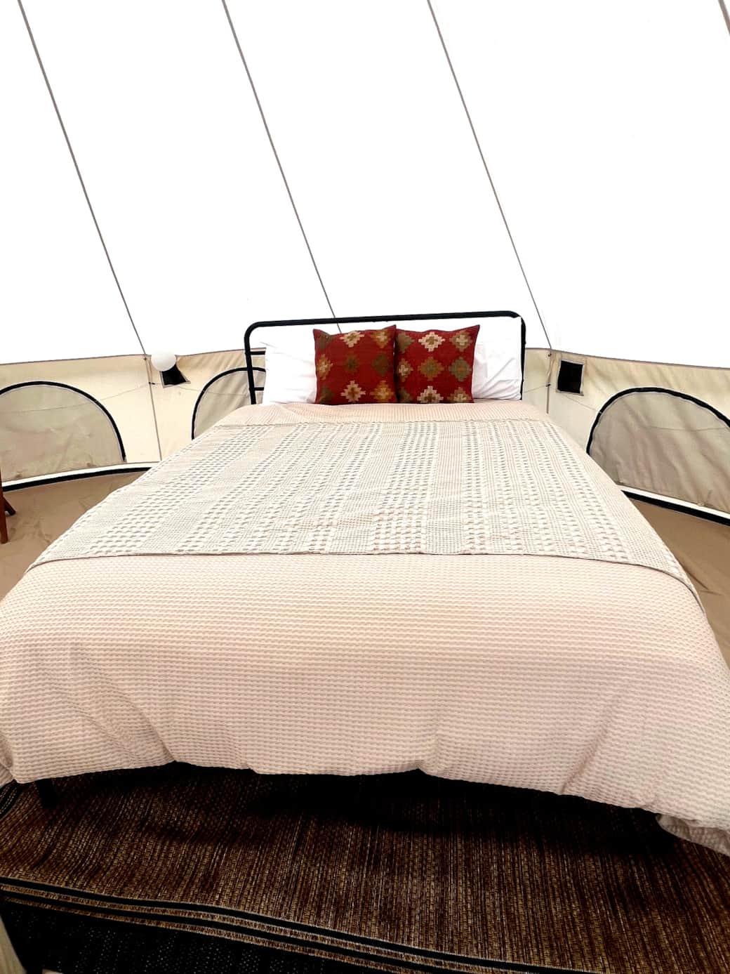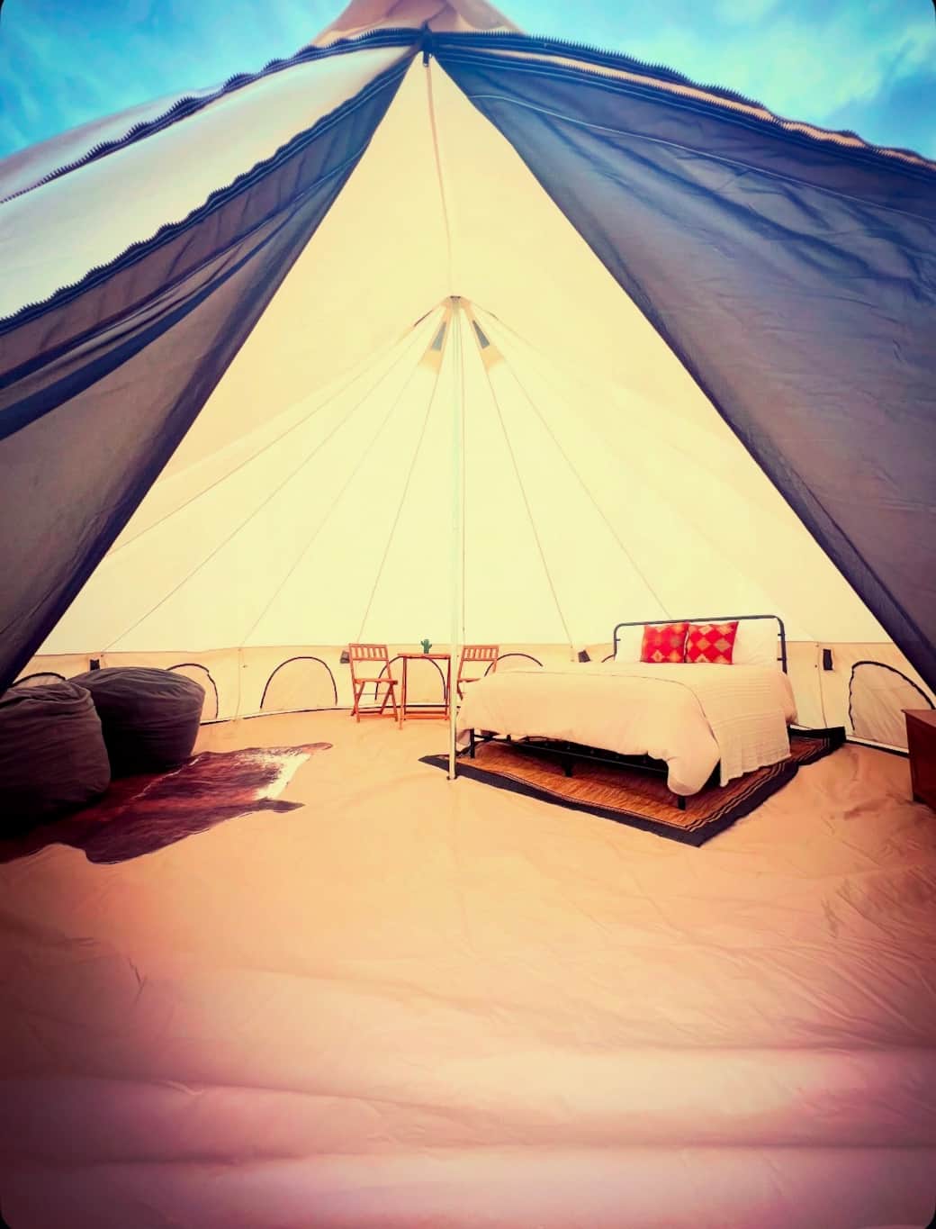 Stay in one of three spacious 20’ all-weather glamping tents, each sleeping up to 2 guests with a queen bed and cozy rustic furnishings for a comfortable stay. Each of the three tents are unique and different from each other.