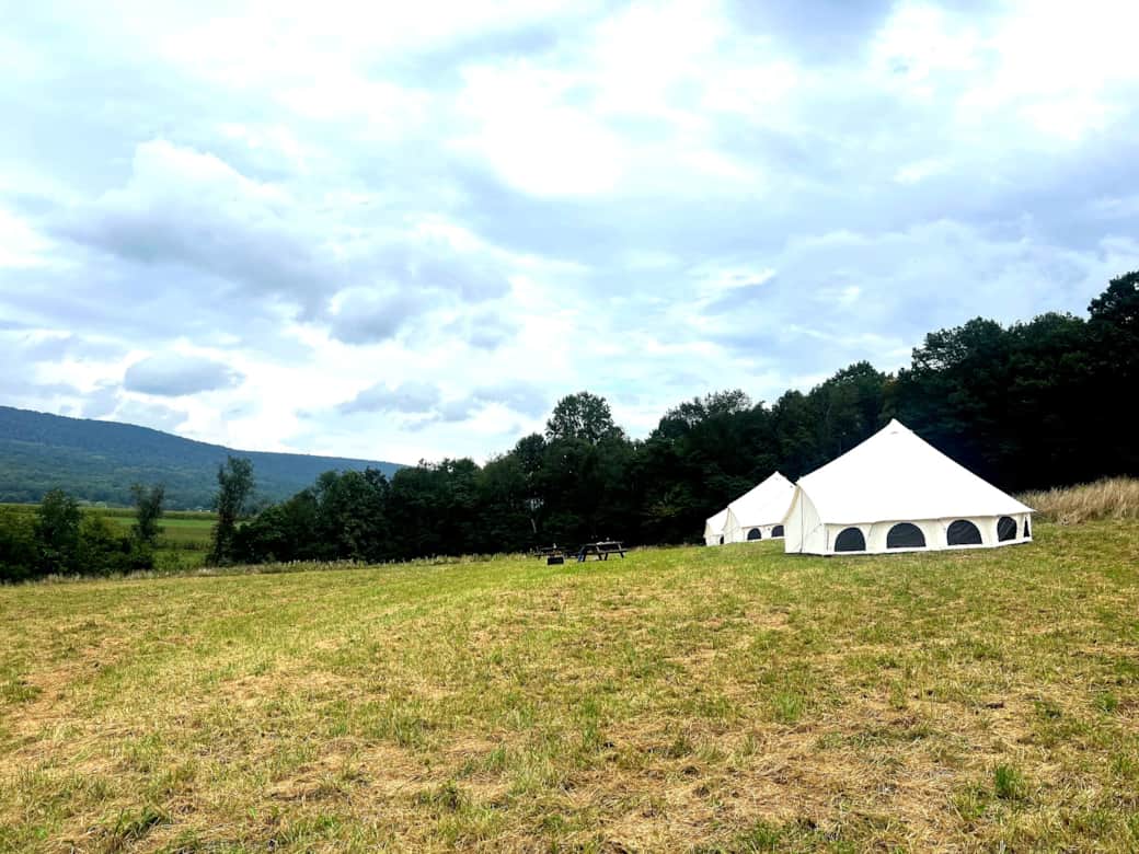By night, unwind around the communal fire pit with 4 Adirondack chairs and gaze at starlit skies. During the day, enjoy outdoor seating at two spacious picnic tables—perfect for meals, games, or simply soaking in the farm views on a small hill where the campsite rests for breathtaking views just outside your tent. Wake to the sounds of goats, horses, and cows on the working farm around you. Spend your days exploring local trails, golfing nearby, or heading to Hersheypark before returning to your private retreat under the stars.